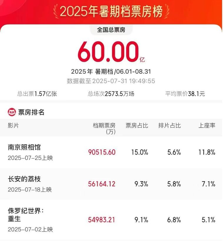2025年暑期档总票房(含预售)破60亿