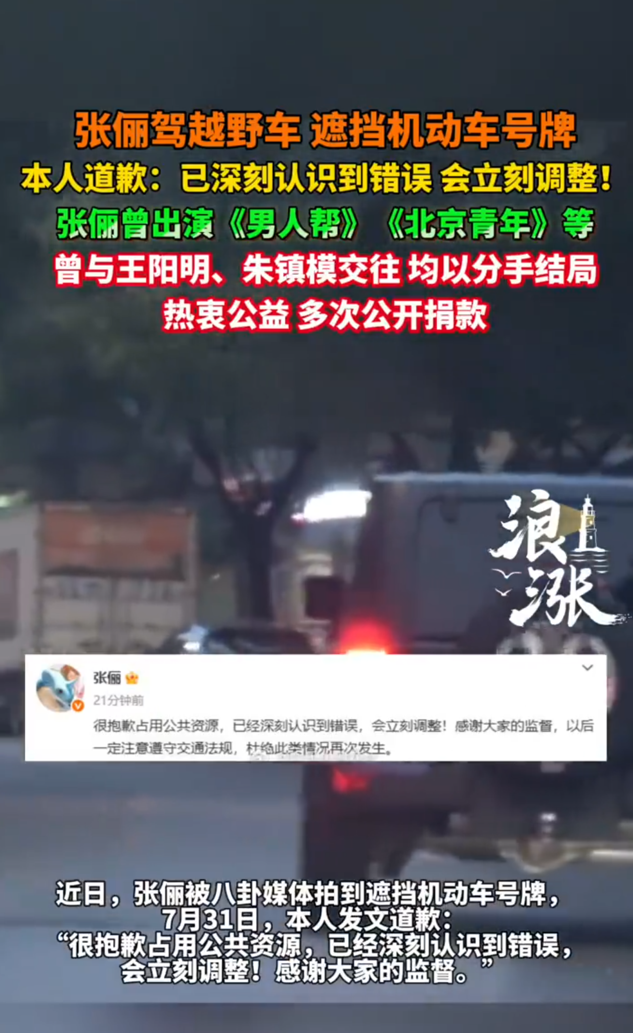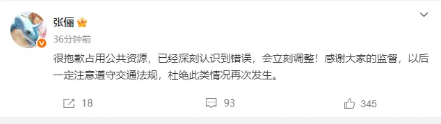 7月31日晚,演员@张俪 发文:很抱歉占用公共资源,已经深刻认识到错误,会立刻调整!感谢大家的监督,以后一定注意遵守交通法规,杜绝此类情况再次发生。