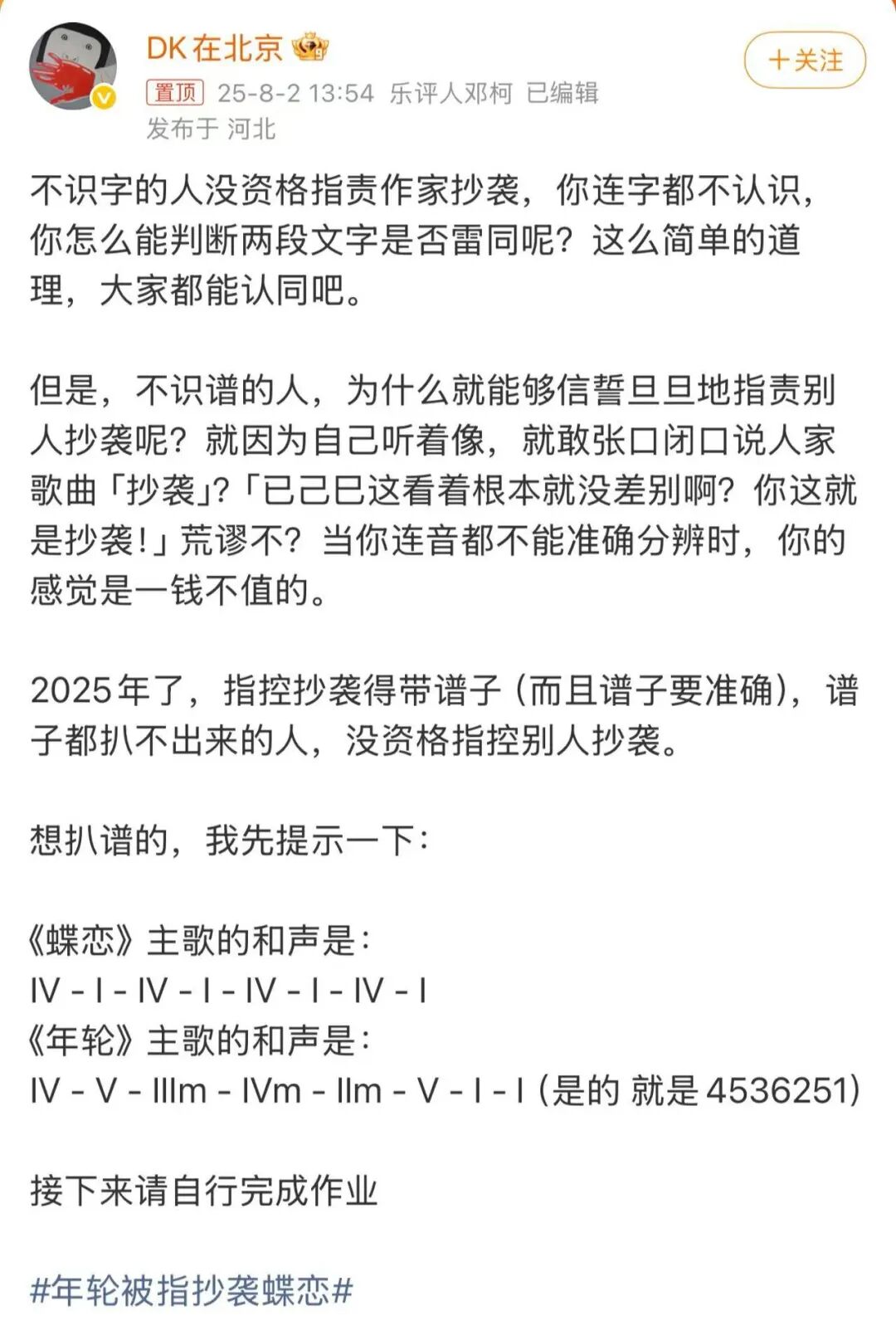 乐评人邓柯发声:“不识谱的人,为什么就能够信誓旦旦地指责别人抄袭呢?”他同时列出证据证明两首歌主歌和声的区别。
