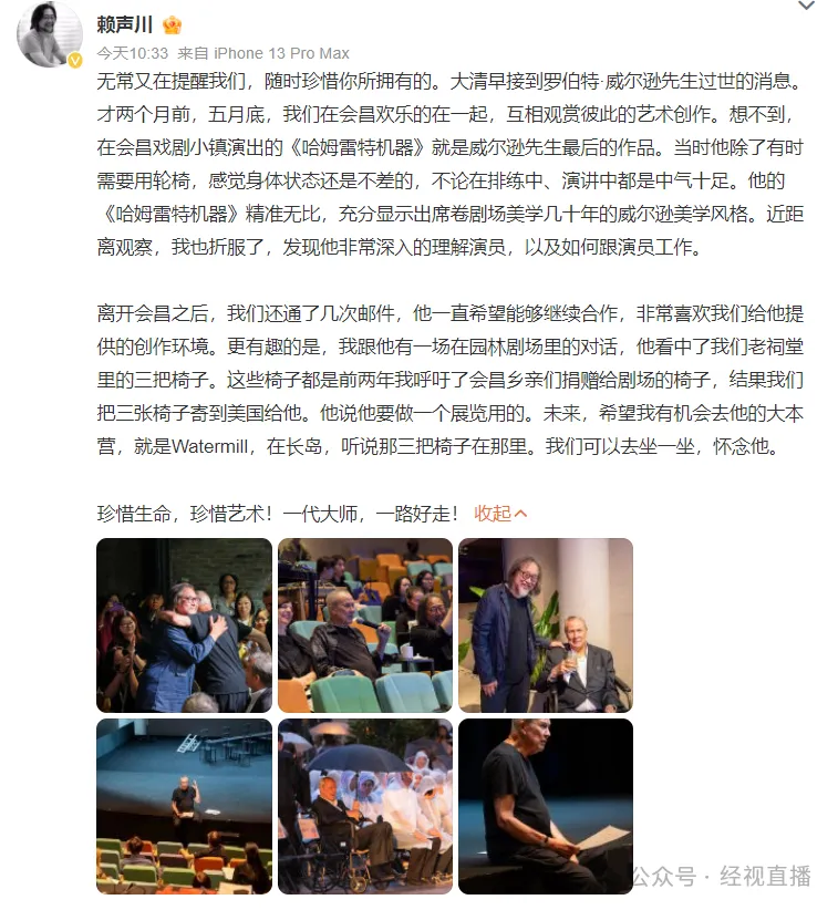 罗伯特·威尔逊今年5月在中国会昌参与青年戏剧家对谈赖声川回忆5月的那次见面时写道,“当时他除了有时需要用轮椅,感觉身体状态还是不差的,不论在排练中、演讲中都是中气十足。他的《哈姆雷特机器》精准无比,充分显示出席卷剧场美学几十年的威尔逊美学风格。近距离观察,我也折服了,发现他非常深入地理解演员,以及如何跟演员工作。”