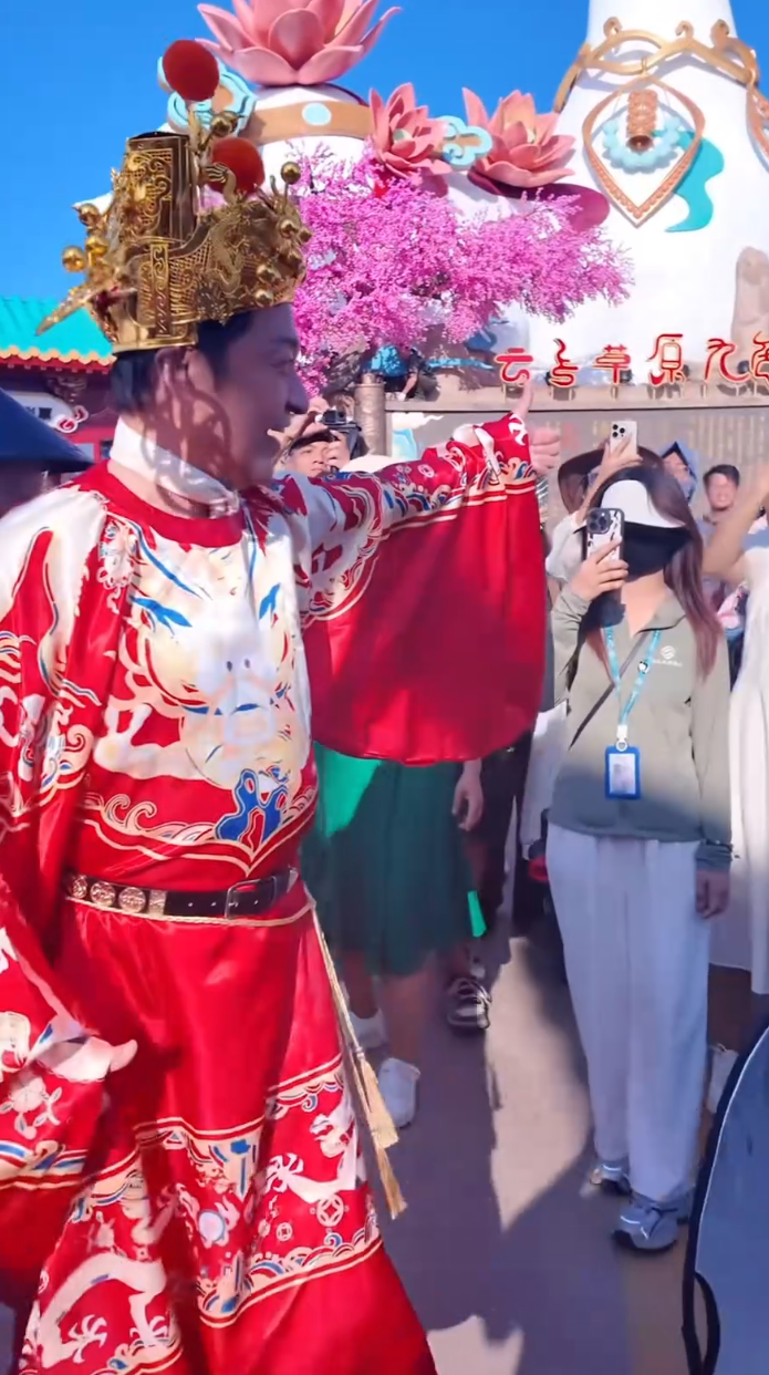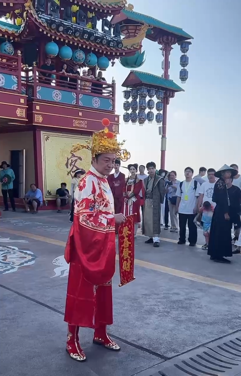8月3日,63岁著名演员马景涛现身浙江某景区,打扮成财神与观众互动,卖力吆喝“马上来财”。