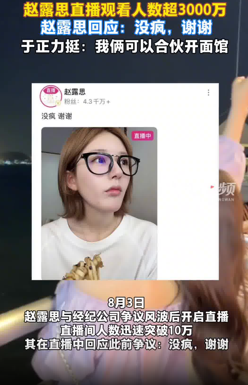 8月3日,赵露思与经纪公司争议风波后开启直播,直播间人数迅速突破10万,其在直播中回应此前争议:没疯,谢谢。她称,“在娱乐圈这些年有点积蓄,不用担心我,实在不行,开个小面馆,人干什么不是一辈子。”