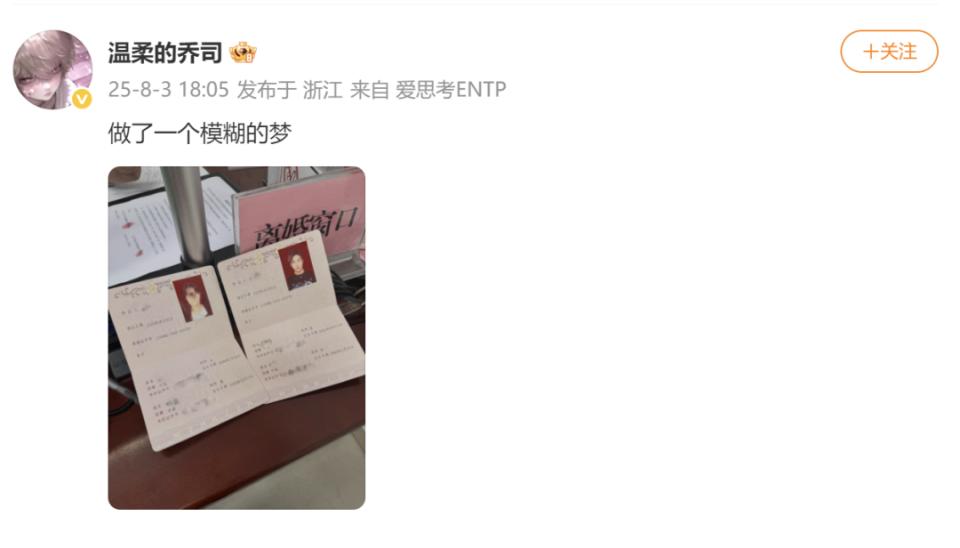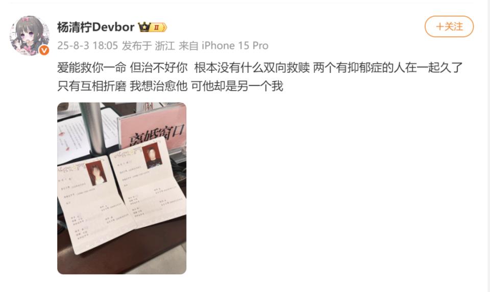 据悉,杨清柠与乔司2023年5月6日领证结婚,同年10月26日举办婚礼,至2025年6月离婚,双方均受抑郁症困扰,婚姻维系不足两年。