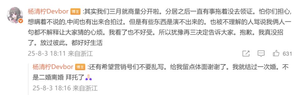 此外,杨清柠还在评论区透露,他们三月就商量分开啦,分居之后一直有事拖着没去领证。并表示放过彼此,都好好生活。她澄清称自己就结过一次婚,不是二婚离婚。