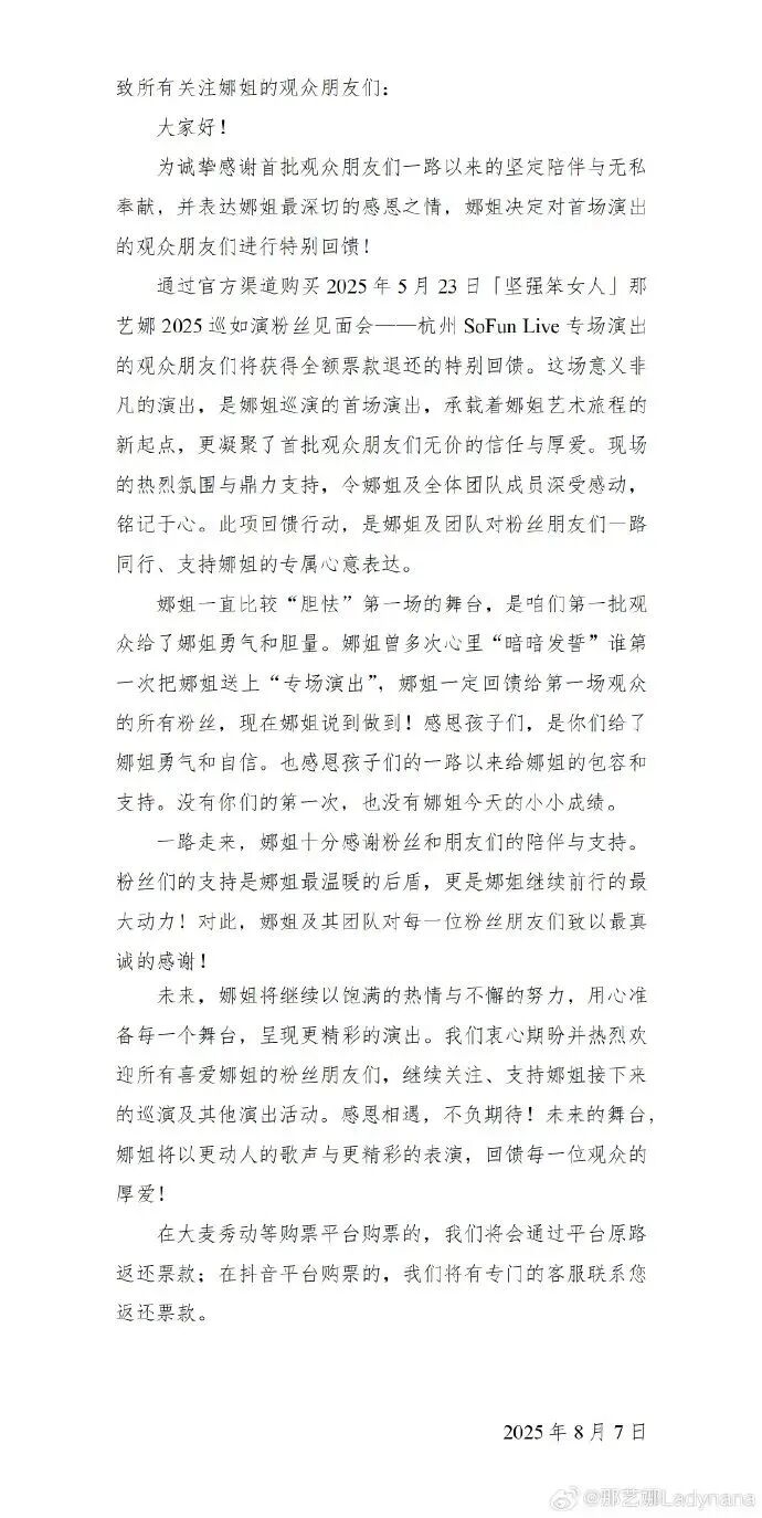 8月7日,网红歌手那艺娜发长文表示,为了感谢首批观众朋友的支持,宣布全额退还5月23日杭州首场票款,作为对首批观众的“感恩回馈”。
