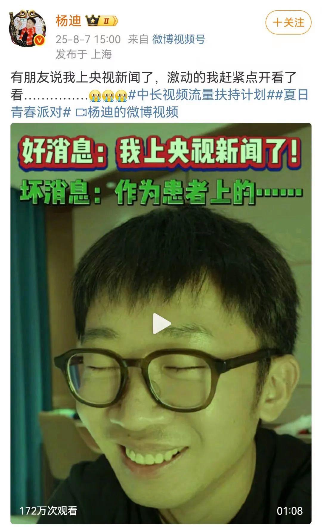 8月7日,“杨迪第一次以这种方式上央视新闻”的词条,冲上热搜。