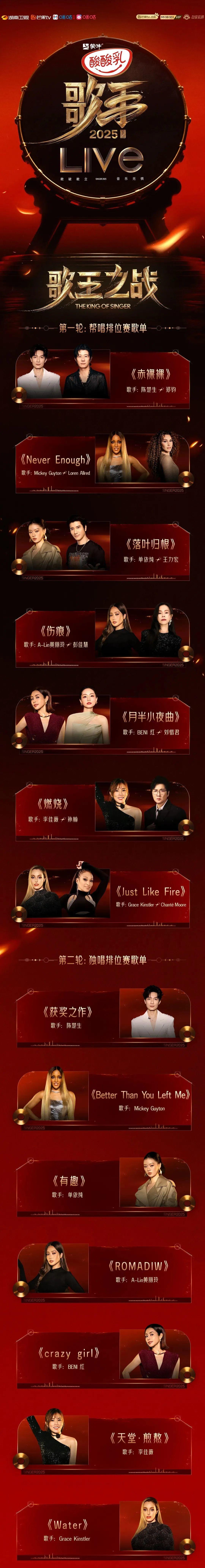 刚刚,《歌手2025》迎来最终对决。陈楚生、Mickey Guyton、单依纯、A-Lin黄丽玲、BENI红、李佳薇、Grace Kinstler七位歌王候选人登台献唱,向歌王宝座发起冲击。