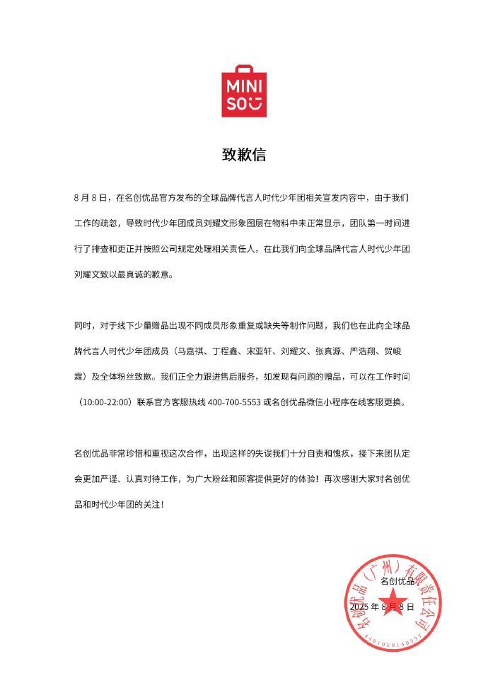 8月8日晚间,名创优品发布《致歉信》:在名创优品官方发布的全球品牌代言人时代少年团相关宣发内容中,由于工作的疏忽,导致时代少年团成员刘耀文形象图层在物料中未正常显示,团队第一时间进行了排查和更正并按照公司规定处理相关责任人,在此向全球品牌代言人时代少年团刘耀文致以最真诚的歉意。同时,对于线下少量赠品出现不同成员形象重复或缺失等制作问题,公司也在此向全球品牌代言人时代少年团成员及全体粉丝致歉。
