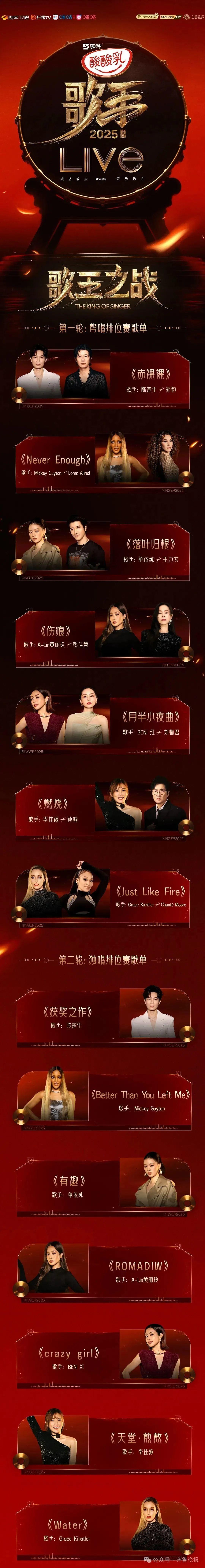 当晚,残酷激烈的赛制为总决赛再添一把火。《歌手2025》歌王之战现场鏖战分为两轮——第一轮帮唱排位赛中,7位歌王候选人与帮唱嘉宾合作演唱,听审进行7选3投票;第二轮独唱排位赛,7位歌王候选人分别独唱演绎,听审再度进行7选3投票,而综合两轮成绩(两轮各占50%)后,本季歌王决出。