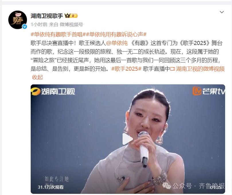 据@湖南卫视歌手微博,歌王候选人单依纯在采访中透露她来节目的目的是“让大家听到什么样的音乐,我有很强烈的,必须要表达的欲望”。面对这一路上做过最不后悔的事情是什么的提问时,她直言是“来歌手!”