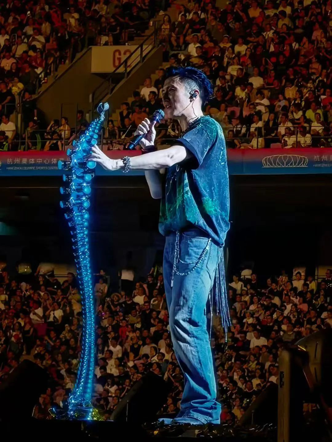 他的台风更成熟了,舞台效果绚丽却不喧嚣,甚至一套演出服从开始到结束都没换过。更多时候,镜头捕捉到的,是他专注投入唱歌的脸,眼神还是那么有穿透力,那份锐利,从未因时间而磨平。