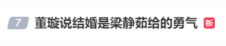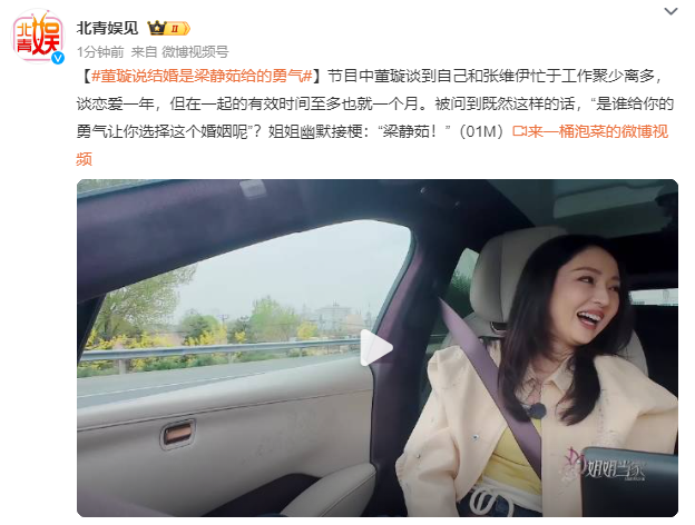 近日,节目中董璇谈到自己和张维伊忙于工作聚少离多,谈恋爱一年,但在一起的有效时间至多也就一个月。被问到既然这样的话,“是谁给你的勇气让你选择这个婚姻呢”?董璇幽默接梗:“梁静茹!”,消息冲上微博热搜。