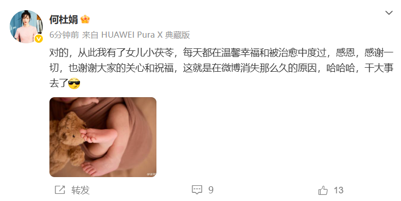 8月13日,演员何杜娟在社交平台发布视频,正式官宣生女,并配文:“我也是有女娃的妈妈啦!”