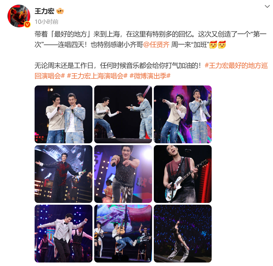 18日晚,王力宏发文告别上海,他写到:带着「最好的地方」来到上海,在这里有特别多的回忆。这次又创造了一个“第一次”——连唱四天!也特别感谢小齐哥@任贤齐周一来“加班”。