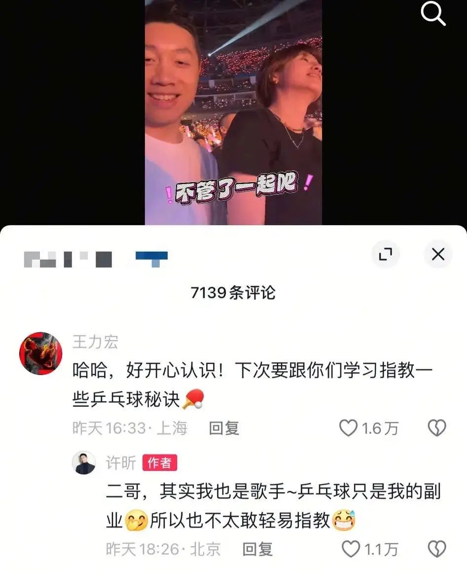 随后,王力宏在评论区留言:“好开心认识!下次要跟你们学习指教一些乒乓球秘诀”。许昕回复:“二哥,其实我也是歌手~乒乓球只是我的副业,所以也不太敢轻易指教。”