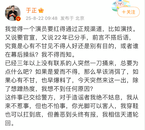 于正的否认引发许荔莎强烈反应。22日9:17,许荔莎发布微博,表示于正撒谎,“从现在开始我说的每一句话都是真的。”