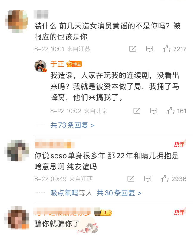 目前,网友对于于正报警、质疑许荔莎蹭热度的说法显然不买账,“你说soso单身很多年,那22年与赵晴拥抱是啥意思啊?纯友谊吗?”