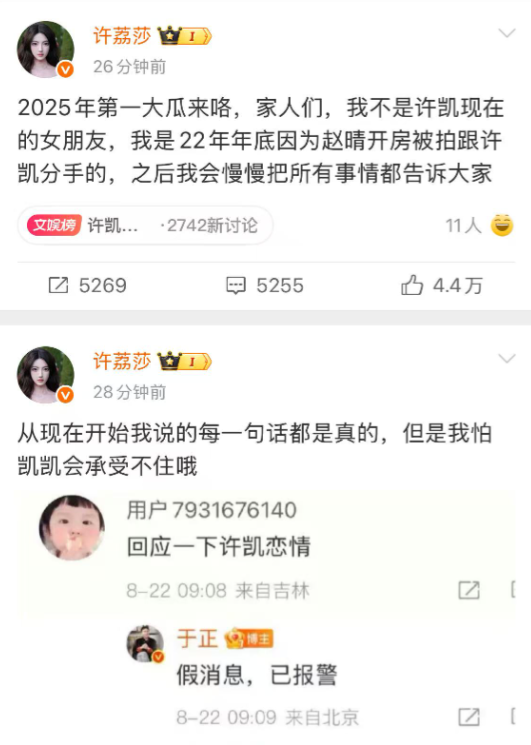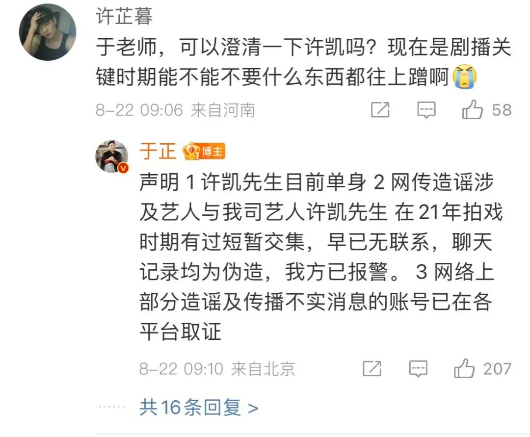 22日上午9:10,于正在微博评论区回复网友,提到许凯单身,有关许凯许荔莎恋情的消息为“造谣”,并表示两人21年拍戏时期有短暂交际,“早已无联系,聊天记录均为伪造,我方已报警。”