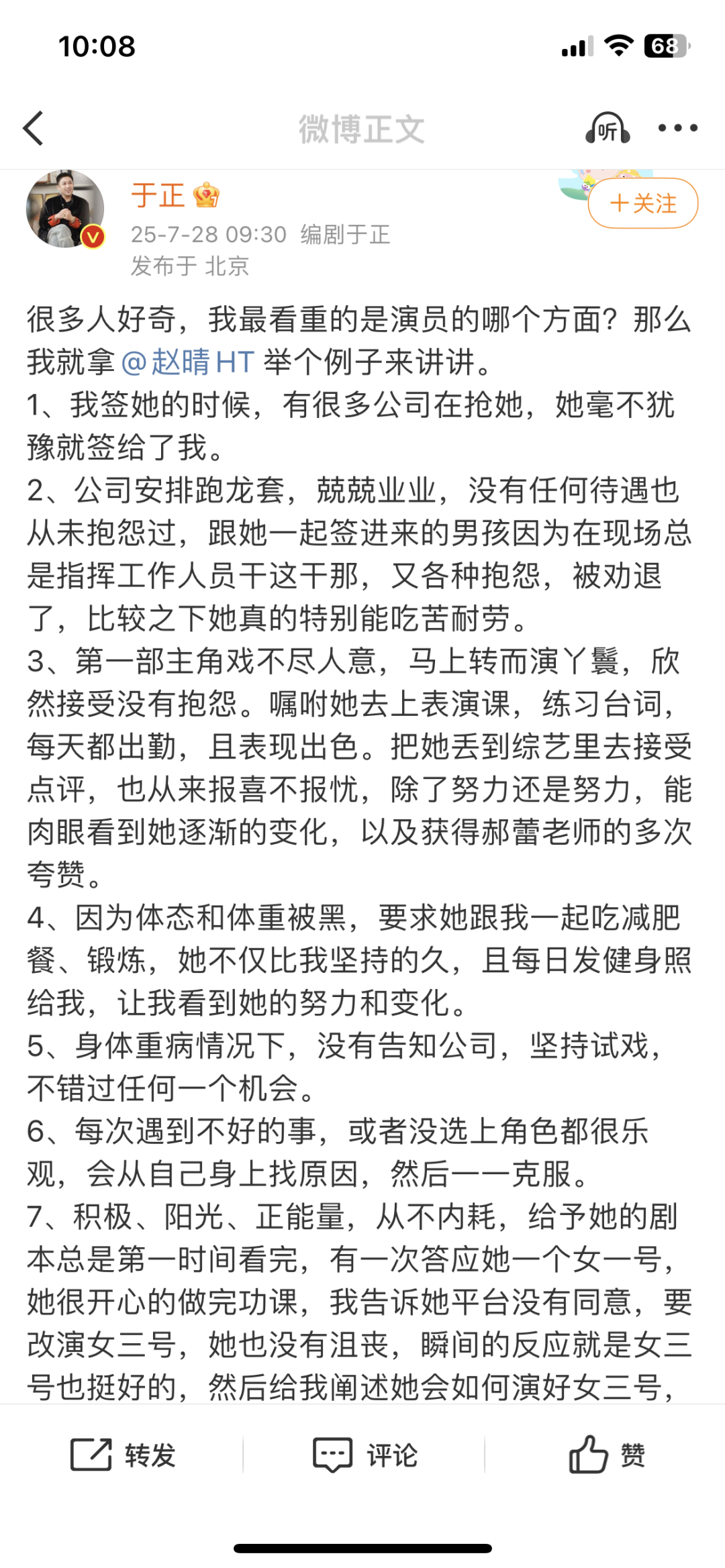 值得一提的是,赵晴也是于正公司的艺人,且为于正当下正在力捧的女演员。光是8月份,于正就为赵晴发送过4条宣传微博。7月28日,于正曾为赵晴发千字表扬长文,表示她工作兢兢业业,努力健身,积极阳光正能量。