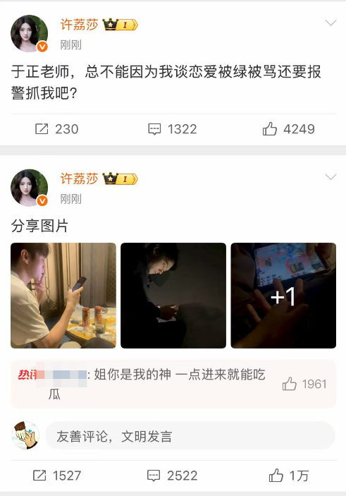 对于于正的说法,许荔莎表示,自己的确不是许凯现在的女朋友,但以前是,“我是22年年底因为赵晴开房被拍跟许凯分手的,之后会慢慢把所有事情告诉大家。”直斥于正目前力捧的女艺人赵晴介入自己与许凯恋情,随后,许荔莎发布多张许凯私密照片。更直面于正:“于正老师,总不能因为我谈恋爱被绿被骂还要报警抓我吧。”