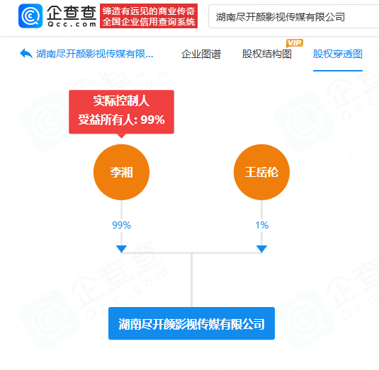 企查查APP显示,近日,湖南尽开颜影视传媒有限公司成立,注册资本300万元。在该公司中,李湘持有99%股权,王岳伦持有1%股权并担任法定代表人、执行公司事务的董事、经理职务。