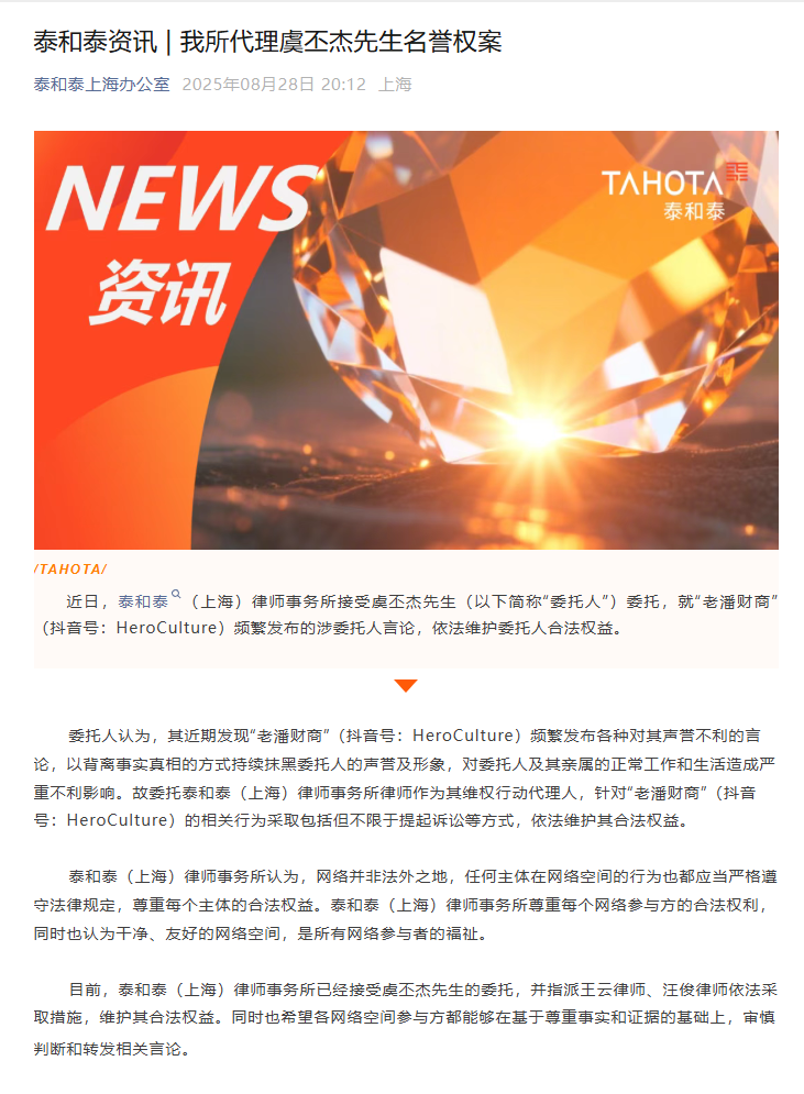 近日,泰和泰(上海)律师事务所接受虞丕杰先生(以下简称“委托人”)委托,就“老潘财商”(抖音号:HeroCulture)频繁发布的涉委托人言论,依法维护委托人合法权益。
