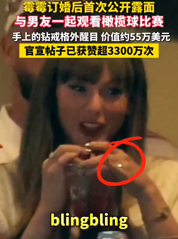 路透视频中,霉霉手上的钻戒闪闪发光,高糊画质也挡不住钻石的火彩。据了解,这是一枚复古风格的8克拉钻戒,预估价值为55万美元。