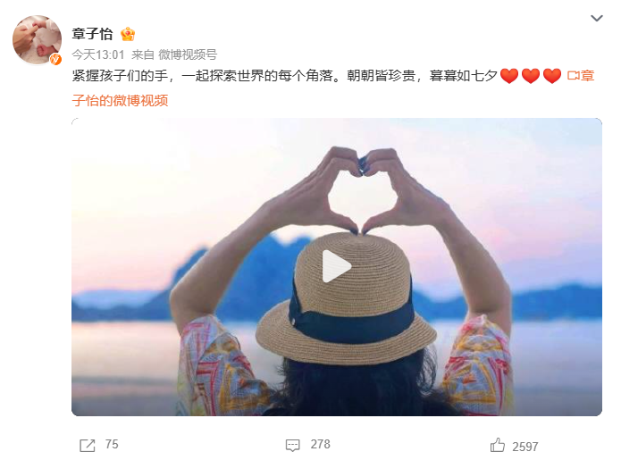 8月29日,演员章子怡在社交平台发文晒娃:“紧握孩子们的手,一起探索世界的每个角落。朝朝皆珍贵,暮暮如七夕”