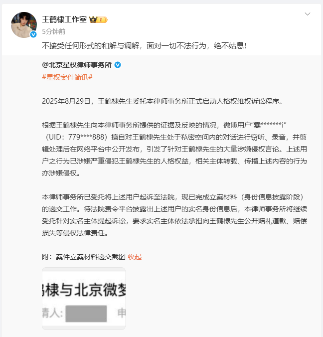 8月29日,王鹤棣工作室发文:不接受任何形式的和解与调解,面对一切不法行为,绝不姑息!
