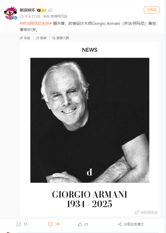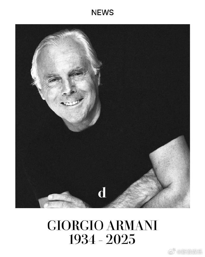据意大利《晚邮报》9月4日报道,意大利时装设计大师Giorgio Armani(乔治·阿玛尼)离世,享年91岁。