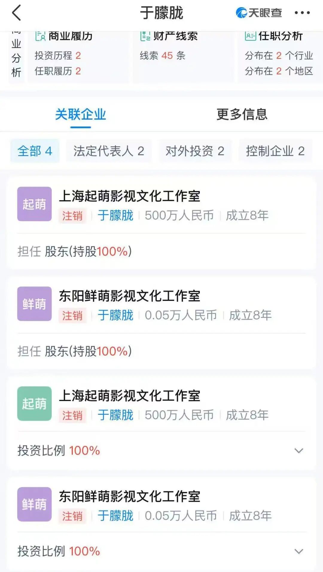 据天眼查显示,于朦胧名下所有持股公司均显示注销,时间分别在去年年底和今年7月。