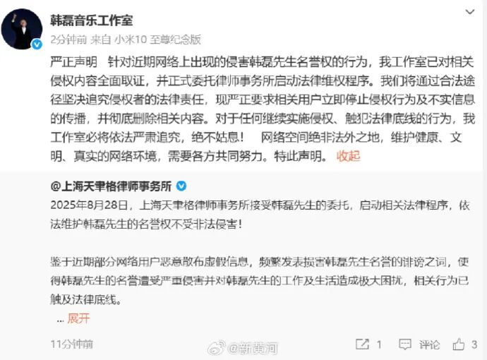 8月28日晚,造谣韩磊出轨事件当事人发布道歉声明 :本人就此前在社交平台发布关于韩磊先生的不实言论,给韩磊先生及其家人、团队造成的名誉损害和困扰,致以最诚挚的歉意。