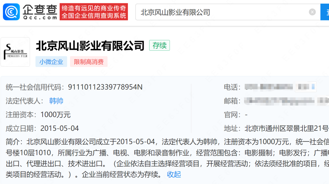 企查查APP显示,近日,北京风山影业有限公司及其法定代表人因未按执行通知书指定的期间履行生效法律文书确定的给付义务被限制高消费。今年6月,该公司已被执行101万余元。企查查信息显示,北京风山影业有限公司成立于2015年5月,注册资本1000万元,经营范围包含电影摄制、影视策划等,由韩帅、韩磊等人共同持股。