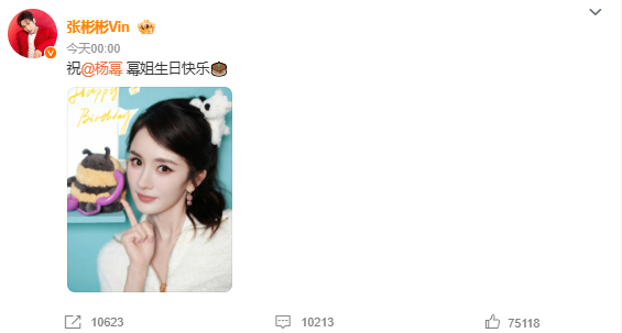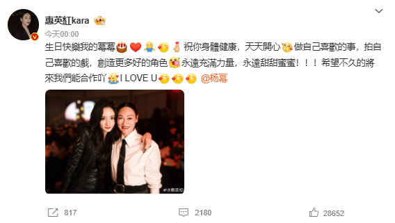 演员惠英红在社交平台发文:“生日快樂我的冪冪,祝你身體健康,天天開心,做自己喜歡的事,拍自己喜歡的戲,創造更多好的角色,永遠充滿力量,永遠甜甜蜜蜜!!!希望不久的將來我們能合作吖!I LOVE U”。