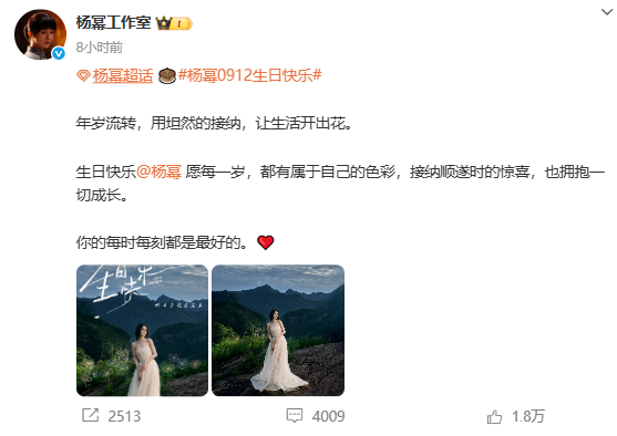 零点刚到,杨幂工作室准时送生日祝福:“年岁流转,用坦然的接纳,让生活开出花。生日快乐@杨幂愿每一岁,都有属于自己的色彩,接纳顺遂时的惊喜,也拥抱一切成长。你的每时每刻都是最好的。❤️”