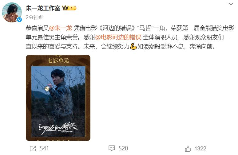 朱一龙工作室发文:恭喜演员朱一龙凭借电影《河边的错误》“马哲”一角,荣获第二届金熊猫奖电影单元最佳男主角荣誉。感谢@电影河边的错误 全体演职人员,感谢观众朋友们一直以来的喜爱与支持。未来,会继续努力💪如浪潮般澎湃不息,奔涌向前。