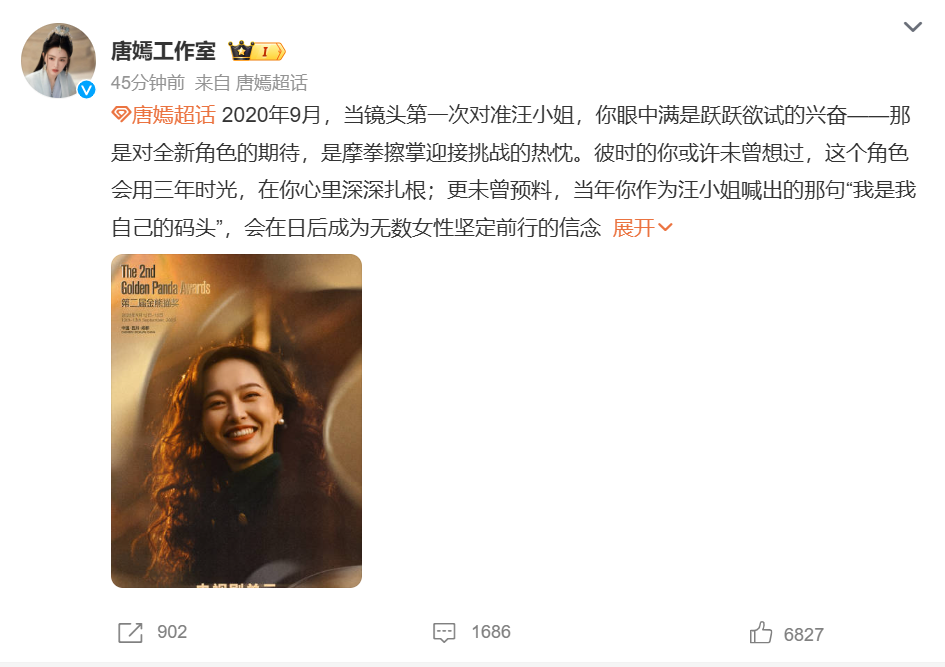 唐嫣凭借电视剧《繁花》,获得第二届金熊猫奖电视剧单元最佳女主角奖。