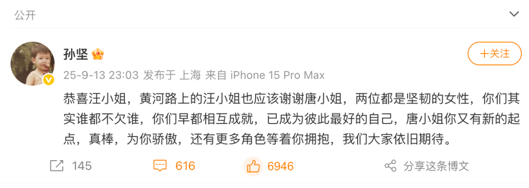中戏同学兼好友孙坚第一时间祝贺:恭喜汪小姐,黄河路上的汪小姐也应该谢谢唐小姐,两位都是坚韧的女性,你们其实谁都不欠谁,你们早都相互成就,已成为彼此最好的自己,唐小姐你又有新的起点,真棒,为你骄傲,还有更多角色等着你拥抱,我们大家依旧期待。