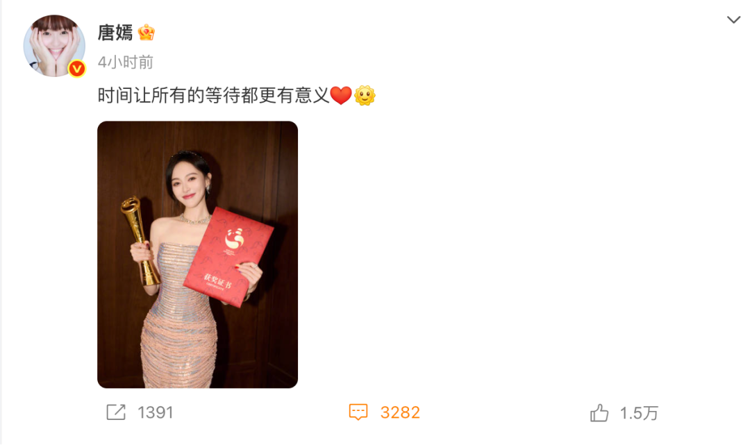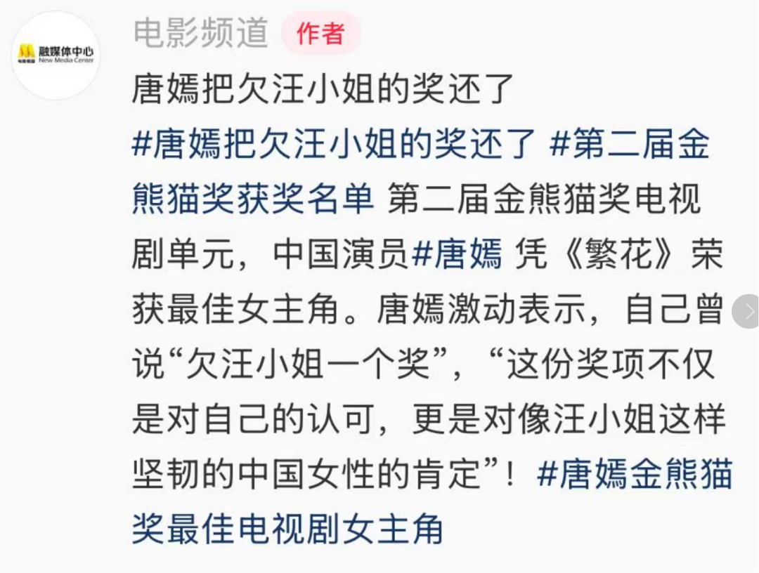 据四川观察和电影频道,唐嫣声音颤抖发表获奖感言:欠“汪小姐”一个奖,今日圆梦,感谢王家卫导演和所有的《繁花》家人。“这奖项不仅是对自己的认可,更是对像汪小姐这样坚韧的中国女性的肯定”