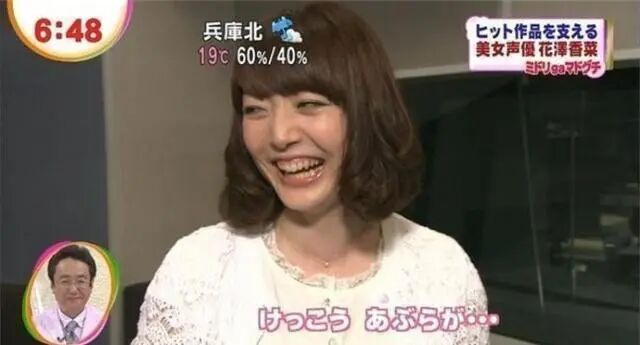 此前,花泽香菜在日本录制节目时,曾因为气氛太嗨而没有控制住自己的笑容。当时,画面上正在同步滚动各地天气预报,刚好放到了兵库县的北部“兵库北 雨 19℃ 60%/40%”,屏幕右上角还有 “美女声优花泽香菜”的字样。