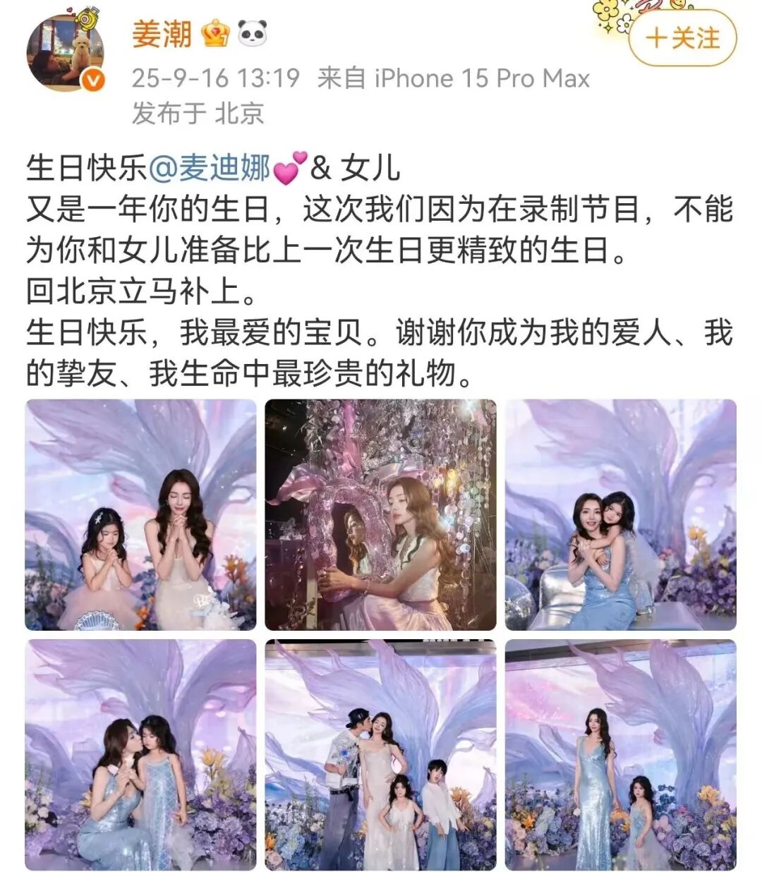 今天下午,姜潮在个人社交平台晒出多张照片为麦迪娜和女儿庆生,并表示,因录节目未能准备精致的生日,回北京立马补上。他还表白麦迪娜:谢谢你成为我的爱人。