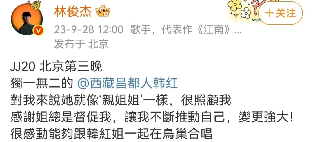 林俊杰之后发文称,“对我来说,她(韩红)就像亲姐姐一样,很照顾我……很感动能够跟韩红姐一起在鸟巢合唱。”