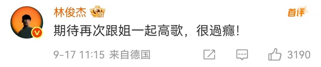 林俊杰在其评论区回复:期待再次跟姐一起高歌,很过瘾!