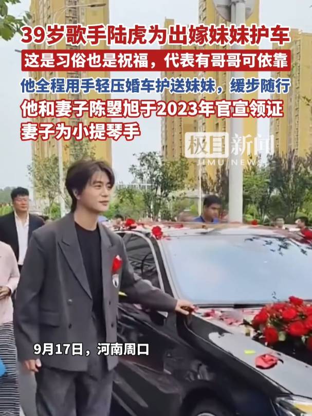 9月17日,有网友晒出知名歌手陆虎的妹妹在河南老家大婚的现场视频。视频中,身为哥哥的陆虎扶车送嫁,满脸喜气。有河南网友表示,扶车护送是当地习俗,代表娘家人对新人的不舍,也寓意新娘有娘家人可以撑腰。