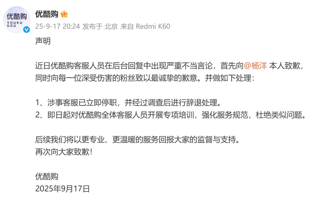 9月17日,有网友在优酷购官方店铺咨询“为何其他明星又亲签小卡,唯独杨洋没有”,客服直接回复“杨洋不爱你们”的对话截图引发热议。当日晚间,@优酷购发声明致歉:“近日优酷购客服人员在后台回复中出现严重不当言论,首先向杨洋本人致歉,同时向每一位深受伤害的粉丝致以最诚挚的歉意。并做如下处理: