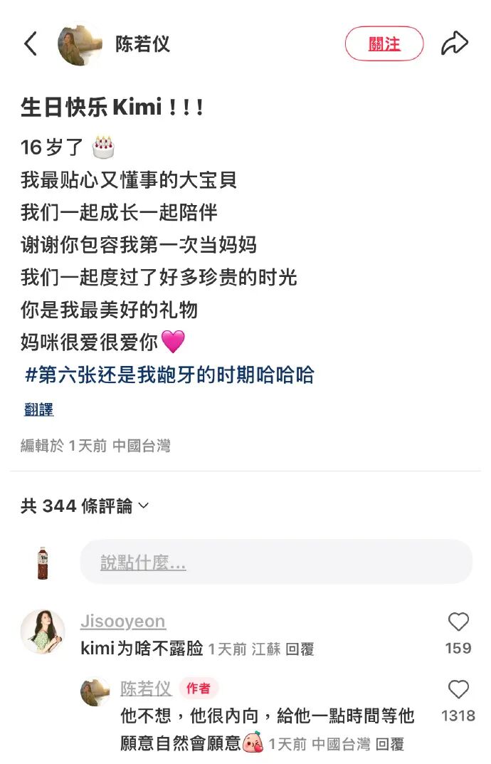 评论区有网友疑问:Kimi为啥不露脸?陈若仪回应:“他不想,他很内向,给他一点时间等他愿意,自然会愿意”。