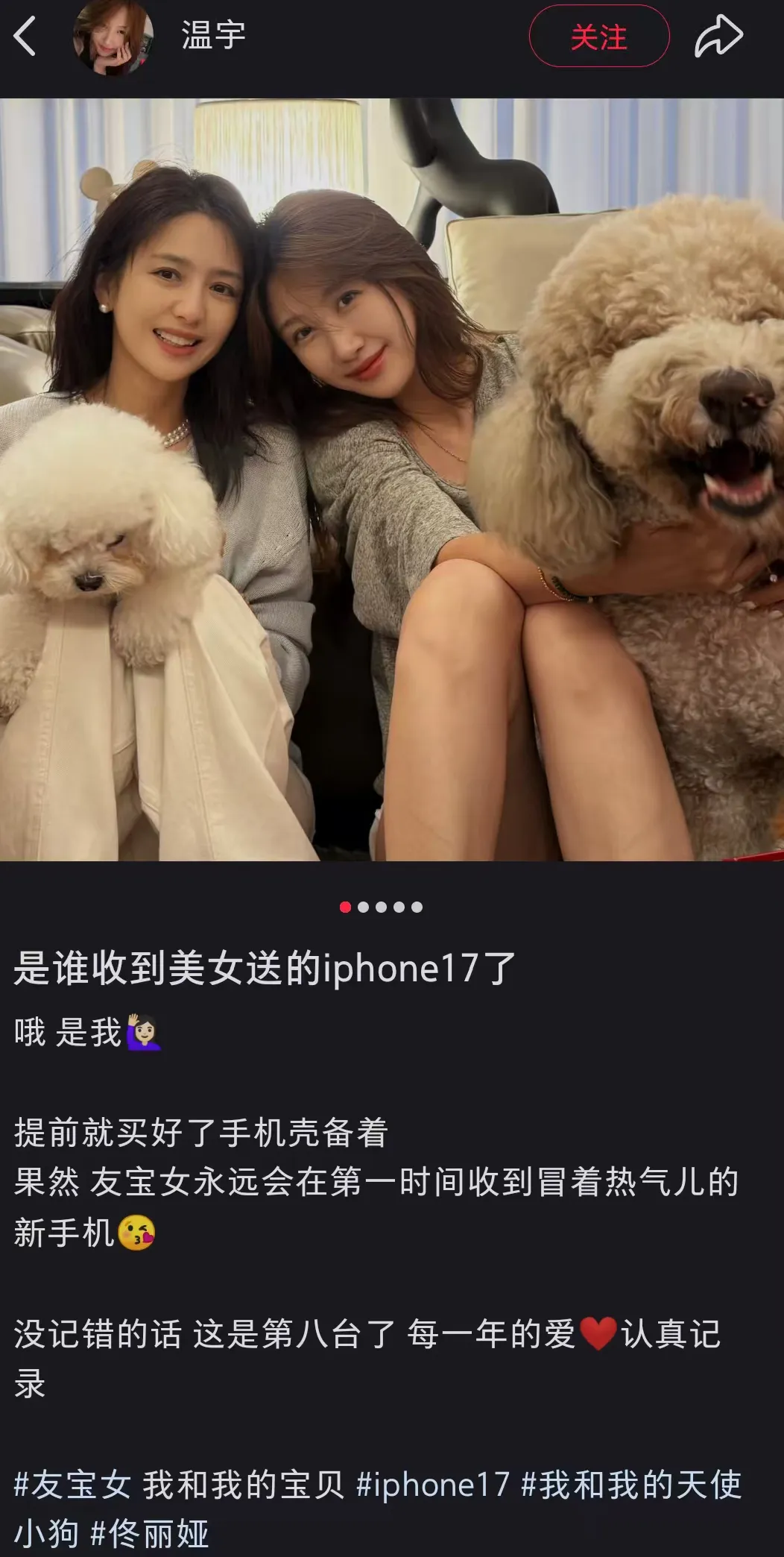 9月24日,曾和佟丽娅、董璇一起出镜《姐姐当家》的温宇在社媒晒出佟丽娅送的橙色iPhone 17 Pro:“是谁收到美女送的iphone17了?是我。提前就买好了手机壳备着。果然,友宝女永远会在第一时间收到冒着热气儿的新手机。没记错的话,这是第八台了,每一年的爱,认真记录。”