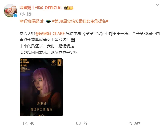 段奥娟工作发文祝贺:恭喜大娟凭借电影《岁岁平安》中刘岁岁一角,荣获第38届中国电影金鸡奖最佳女主角提名!未来的路还长,我们一起慢慢走~要继续闪闪发光,继续岁岁平安呀。