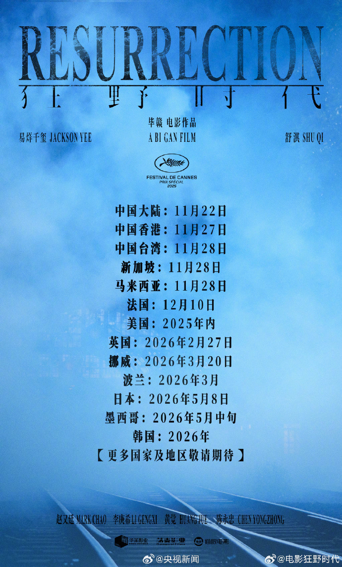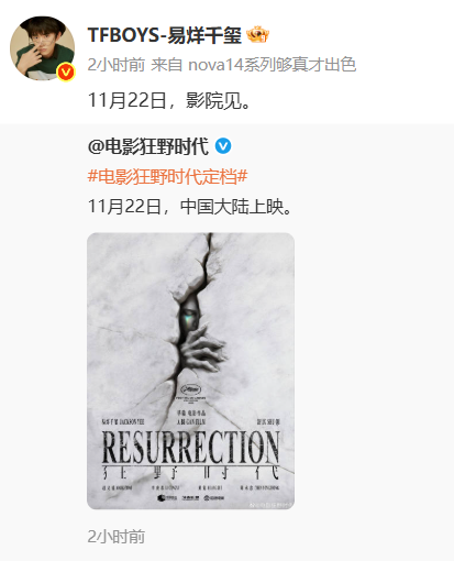 9月28日,电影《狂野时代》宣布定档,11月22日中国大陆上映,全球上映同步启动。该片由毕赣执导,易烊千玺、舒淇领衔主演。易烊千玺在片中挑战性出演了五个角色,令人期待。