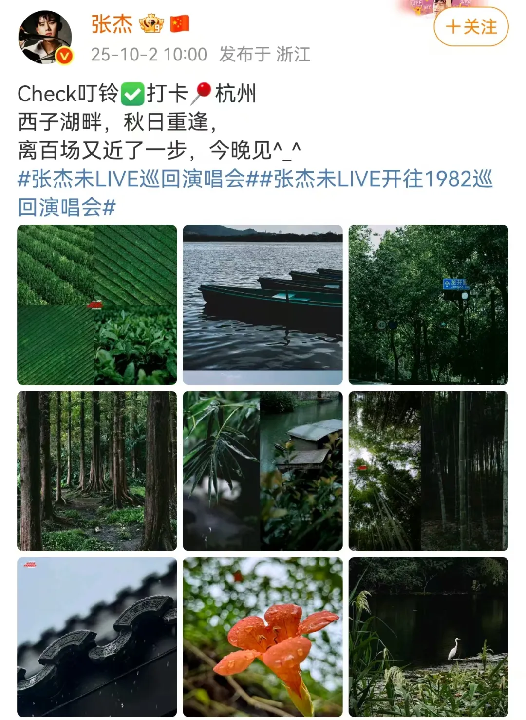 今天(10月2日)晚上,歌手张杰将在杭州举行演唱会。开唱之前,他先在杭州当了一回游客。当天上午,张杰在个人社交平台晒出多张美景照,并配文:打卡杭州,西子湖畔,秋日重逢,离百场又近了一步,今晚见。